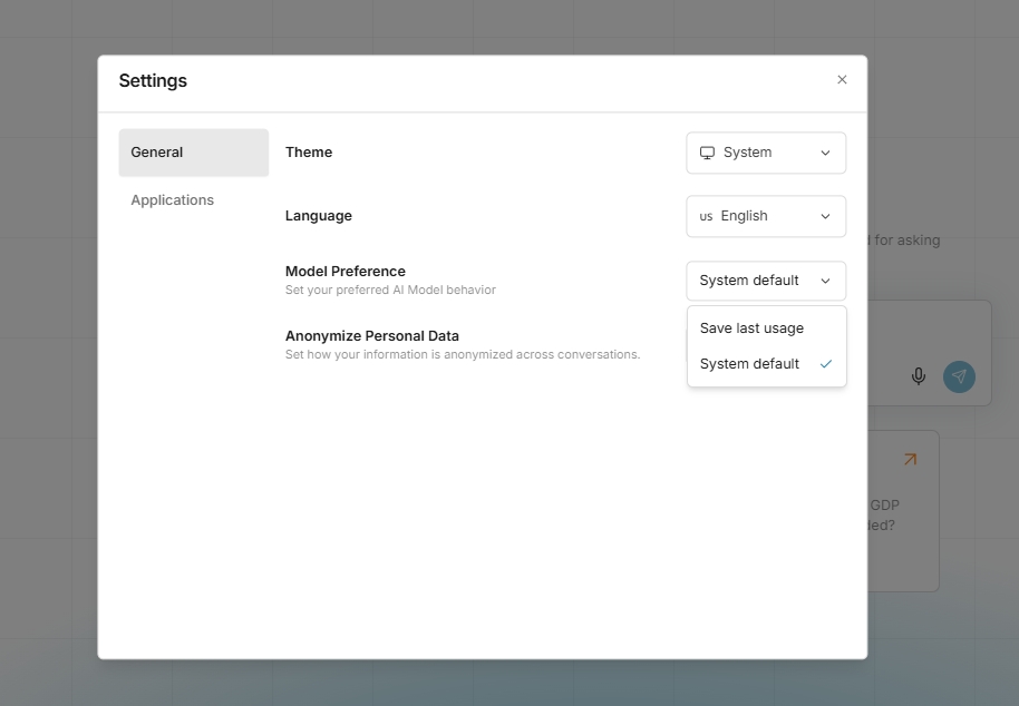 This feature allows you to select preferences for the LLM Model and the Anonymize Personal Data configuration, which will be applied during interactions with the bot. To access this menu, simply go to the profile settings. In the General tab, you will find options for Model Preference and Anonymize Personal Data. "System default" means that the Model Selection or Anonymize Personal Data will follow the preset configurations of the system. "Save last usage" indicates that the last selected configuration (LLM Model or Anonymize Personal Data) will be applied to your next chat with the bot. *Note: The current implementation saves preferences in the browser's local storage. Therefore, if you switch to a different browser or device, it will revert to the system default settings.
