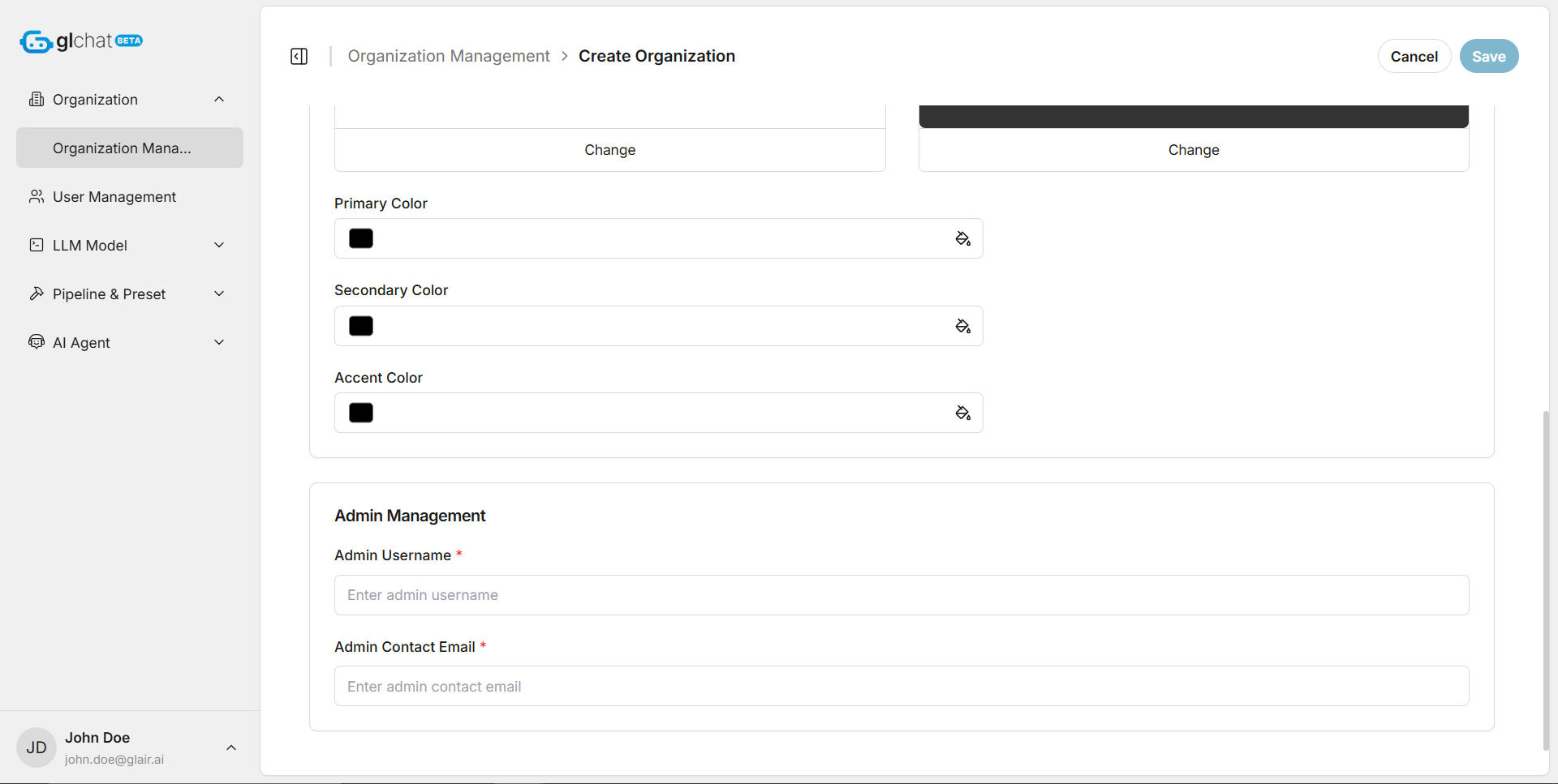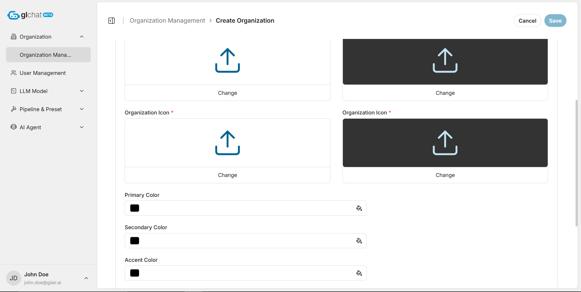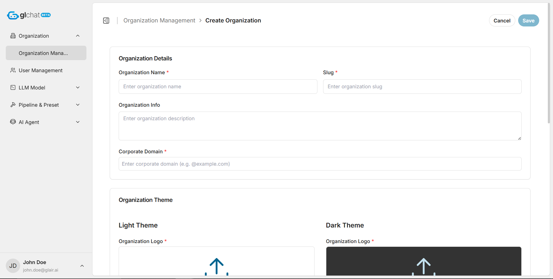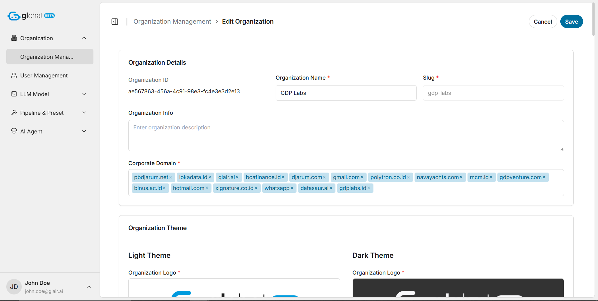 On the **Edit Organization** page, a Global Admin can update almost all settings originally configured during organization creation. This includes changes to the organization name, description, corporate domain, branding assets (such as light and dark logos), and other organization details.