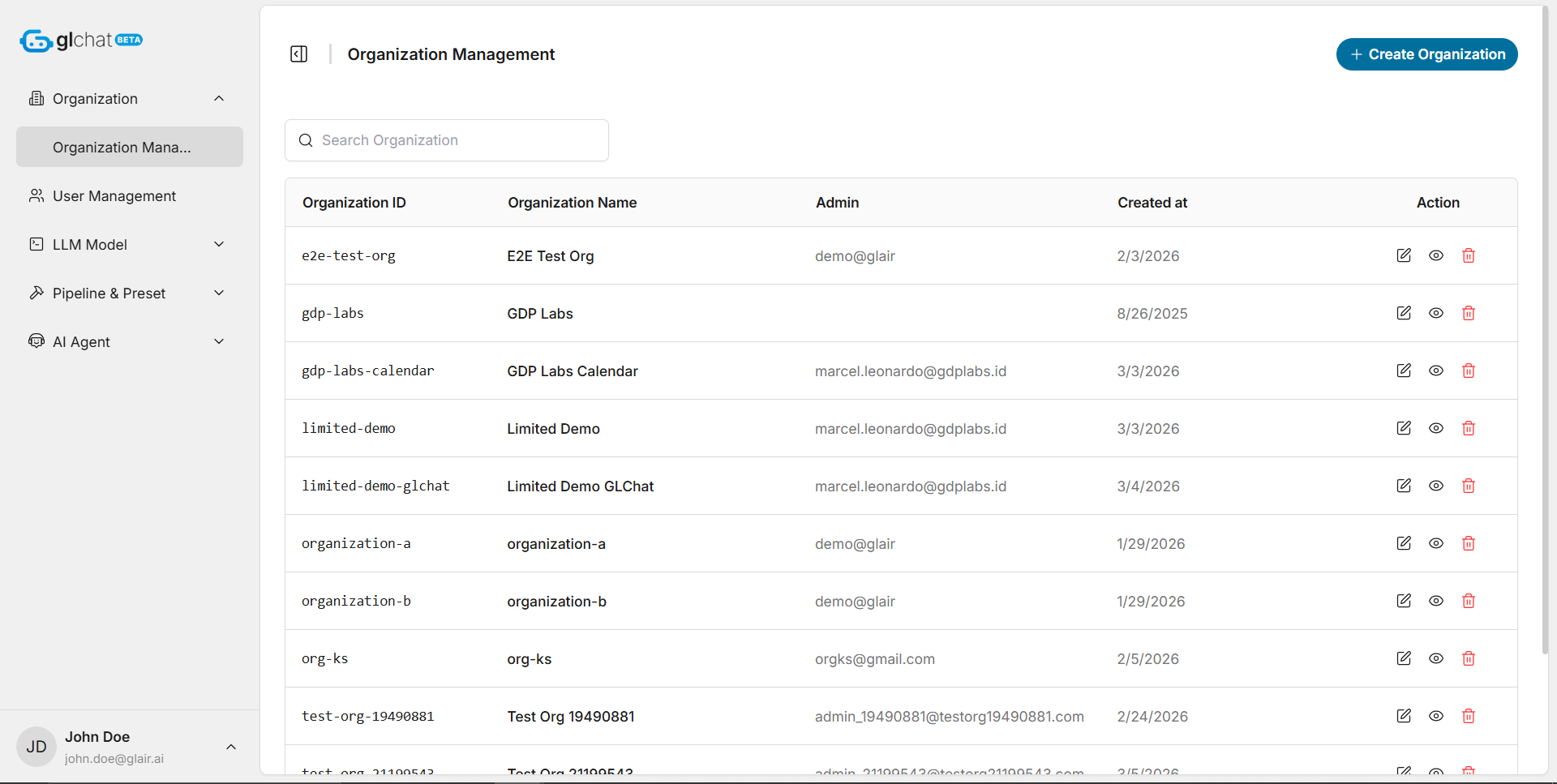 A built-in search helps Global Admins quickly locate specific tenants. From the directory, a Global Admin can select an organization to view its detailed profile, update organization properties, or delete the tenant using the actions in the rightmost column.