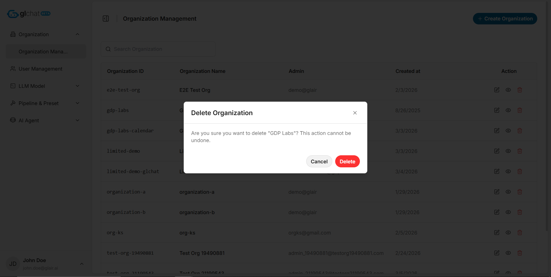 When selected, the system displays a **confirmation modal** to verify the action before proceeding. Once the Global Admin confirms, the system runs the deletion workflow and removes the organization from the active list.