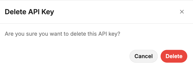 To delete an API key, click the **Trash** icon in the Action column. A confirmation pop-up will appear, click **Delete** to confirm or **Cancel** to abort the action.