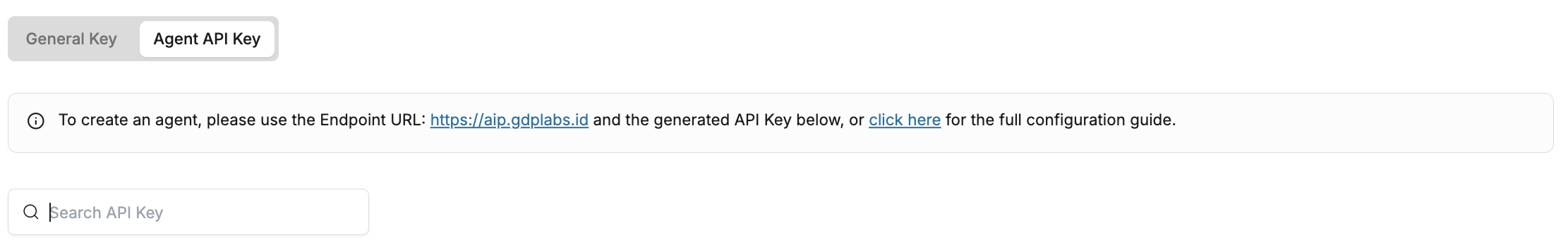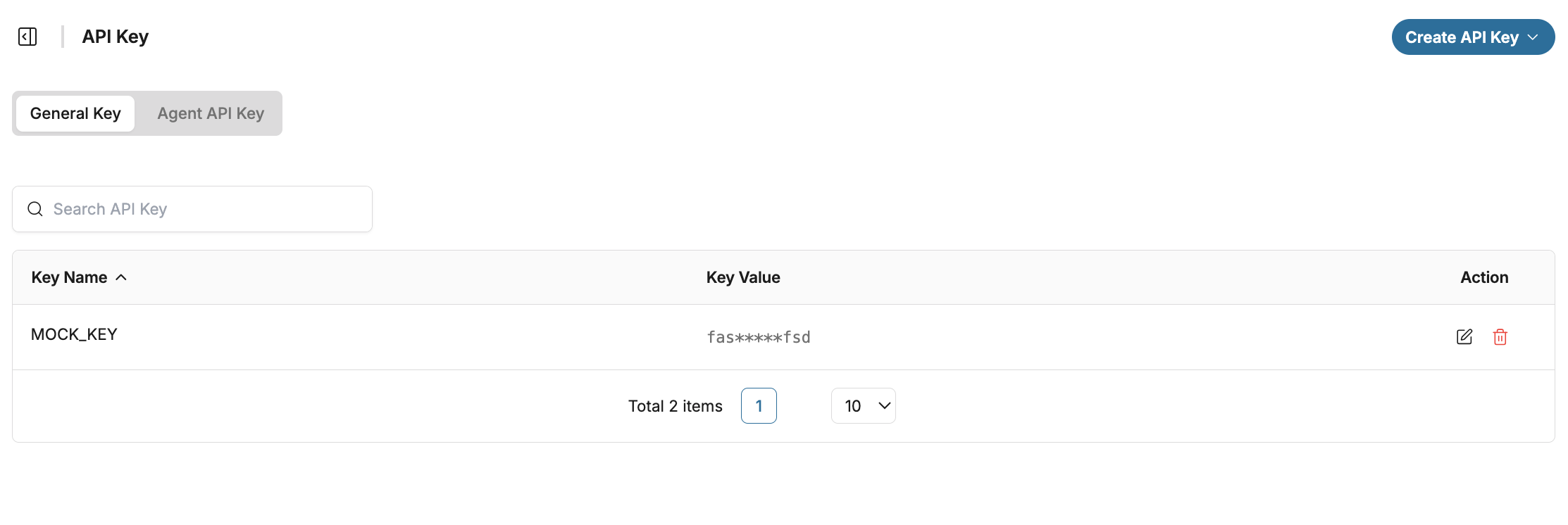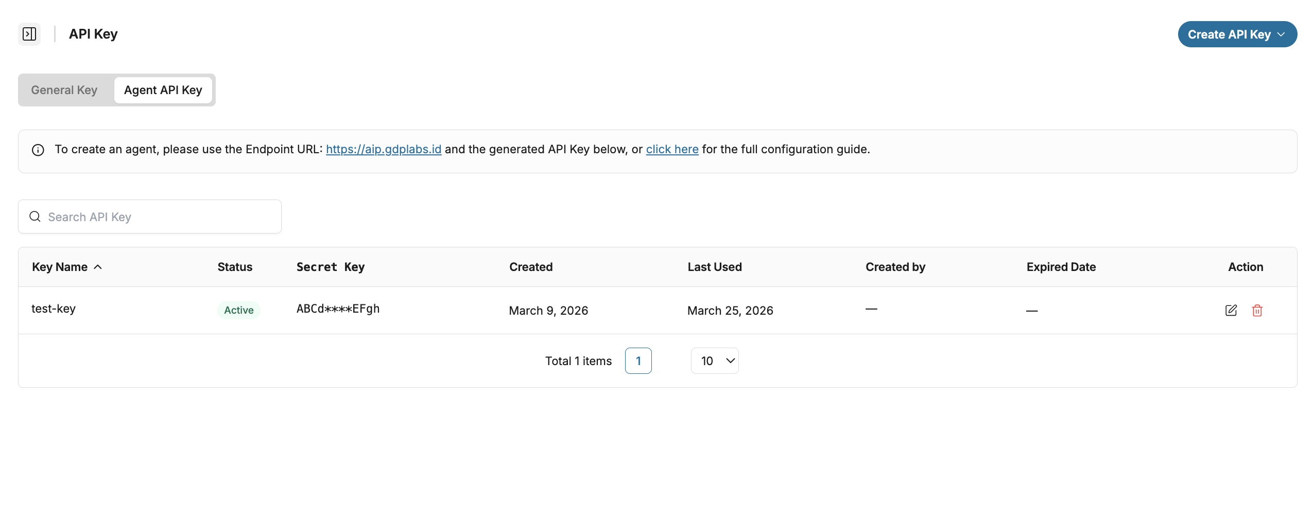 The **Agent API Key** feature allows users to generate and manage API Keys used for authenticating and integrating agents within the system. Users can monitor and manage API Keys to ensure secure and controlled access for agent operations.