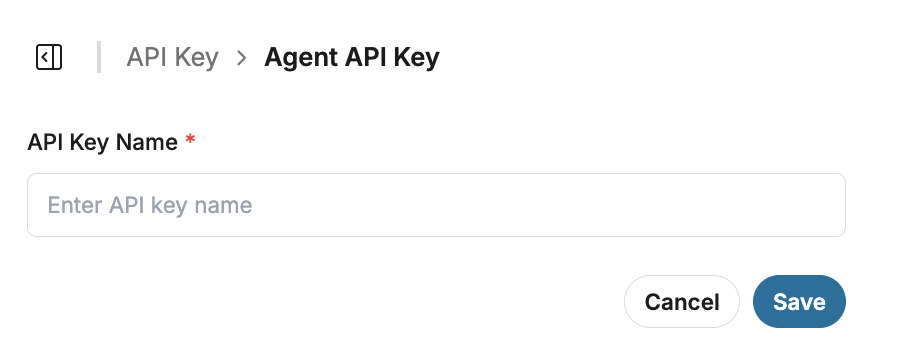 To create a new API key, click **Create API Key** and select **Agent API Key**. Fill in the required field below, then click **Save** to store the key or **Cancel** to discard the changes.