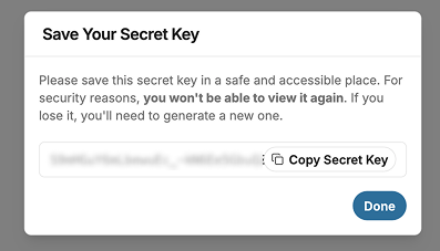 The Secret Key is displayed only once and cannot be retrieved again after closing the popup. Make sure to **copy and store it securely.**
