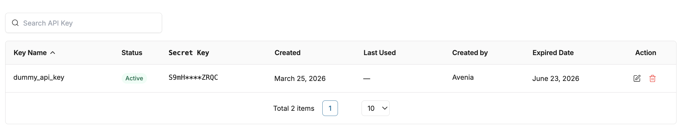 To view or edit an existing API key, click the **Edit** icon in the **API Key List** page. After making changes, click **Save** to apply them or **Cancel** to discard.