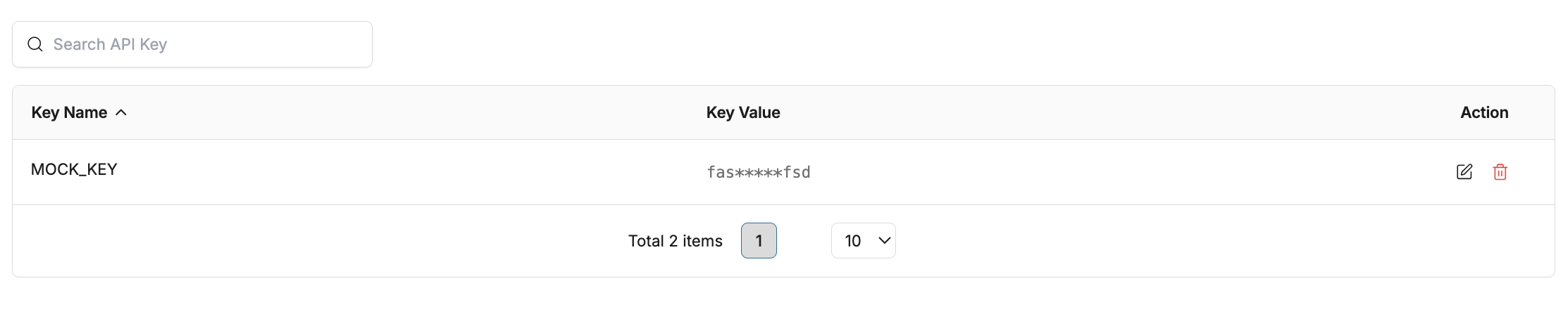 The **API Key** feature allows you to define and manage your own API keys for external LLM providers or models. Once created (e.g., `MY_API`), the key can be linked to any LLM provider or model in your environment. When selected, the system automatically uses the defined API key for authentication eliminating the need to re-enter it each time.