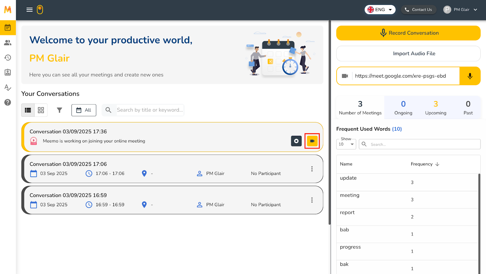 1. [**Meeting Platform Integration**](#google-meet-integration) – Invite Meemo to your online meeting.