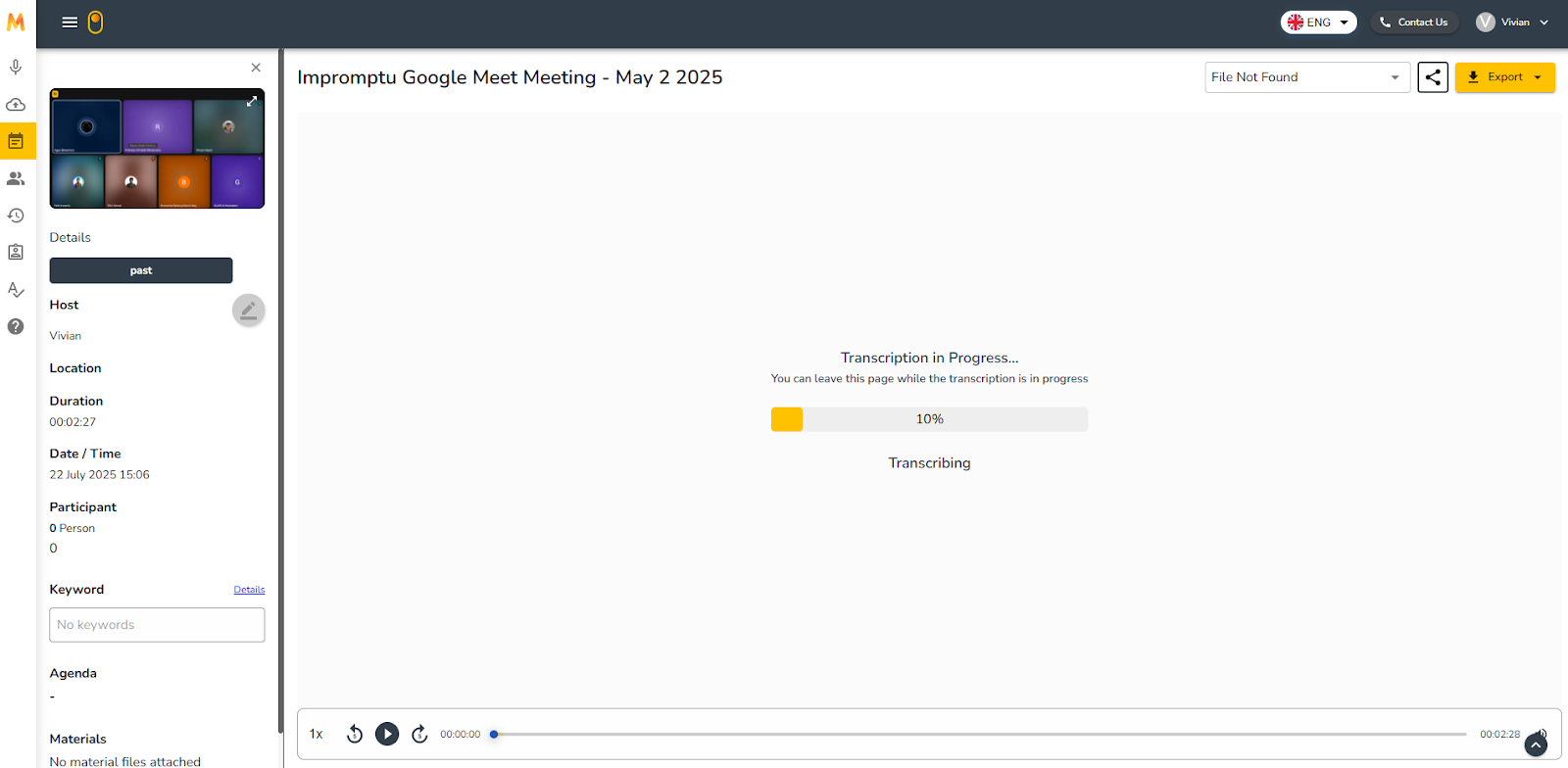 Here is the display of the meeting detail page when the transcription process is in progress.