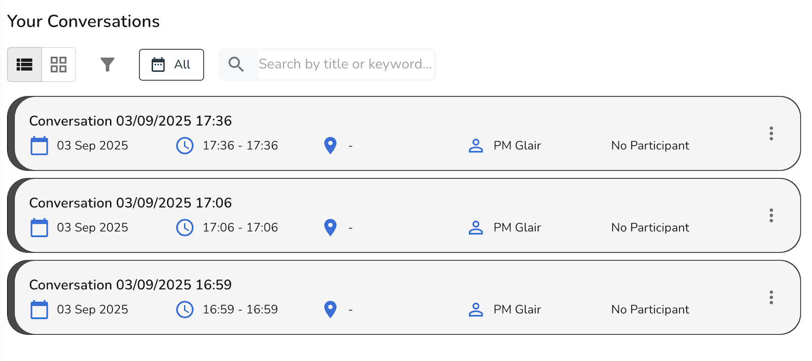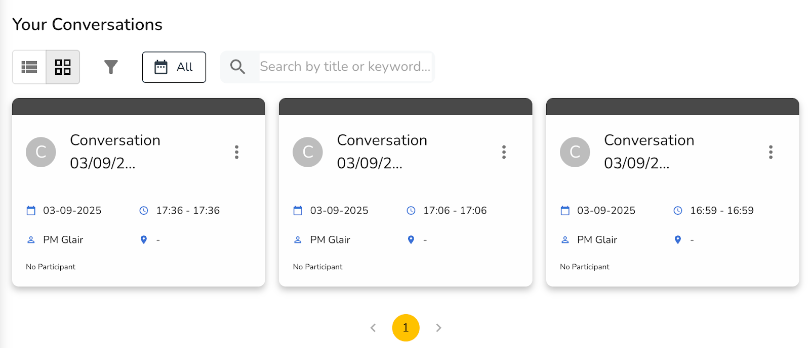 The dashboard displays your meetings in the section called **Your Conversations**. You can switch between two display modes: