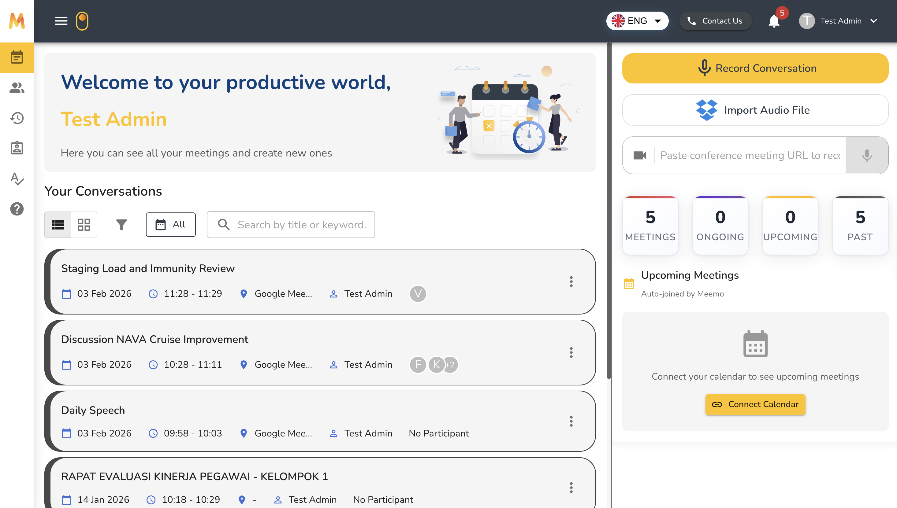 Once you log in to Meemo, you will be directed to the **Dashboard**. The dashboard is your central workspace, where all of your meetings are listed, organized, and accessible. From here, you can quickly see the status of ongoing meetings, review past sessions, and prepare for upcoming ones.
