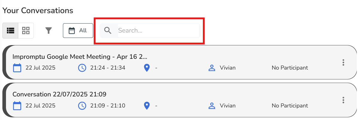 1. **Search Bar** – Enter a meeting title or keyword to locate specific conversations.