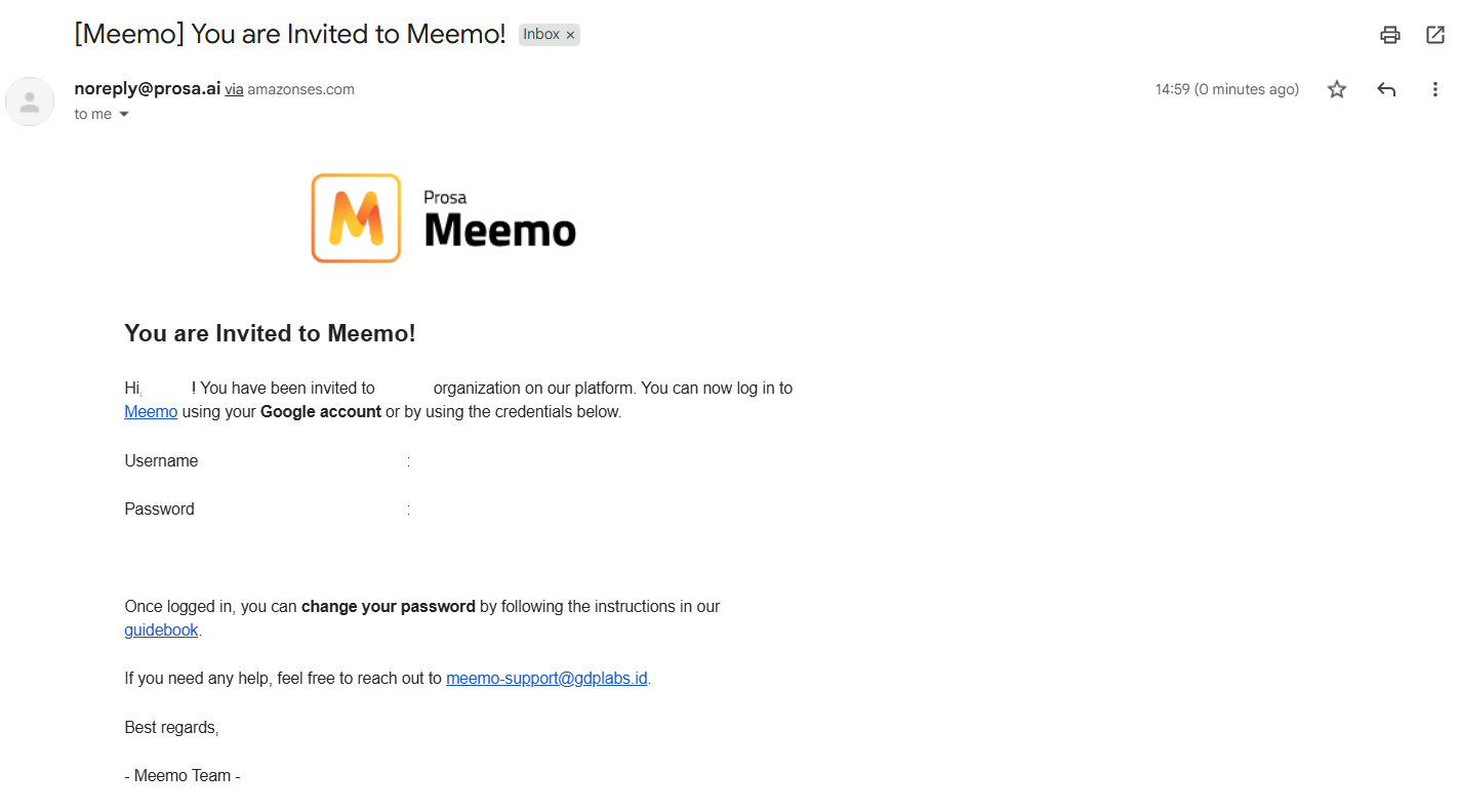 The email includes the Username defined by the admin and a system-generated Password. The member can use these credentials to access Meemo right away.