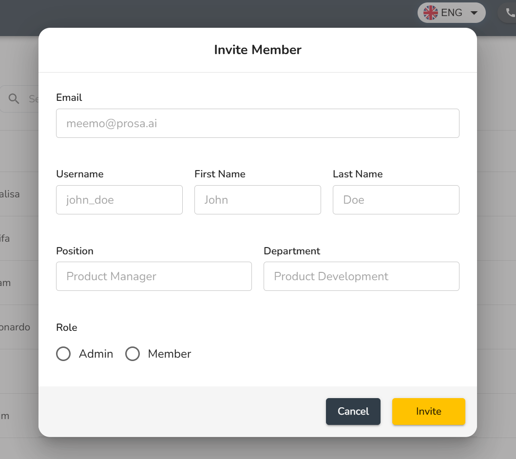 After completing all required fields, click Invite. The system will automatically save the new member’s data, and the member will be added to your organization immediately.