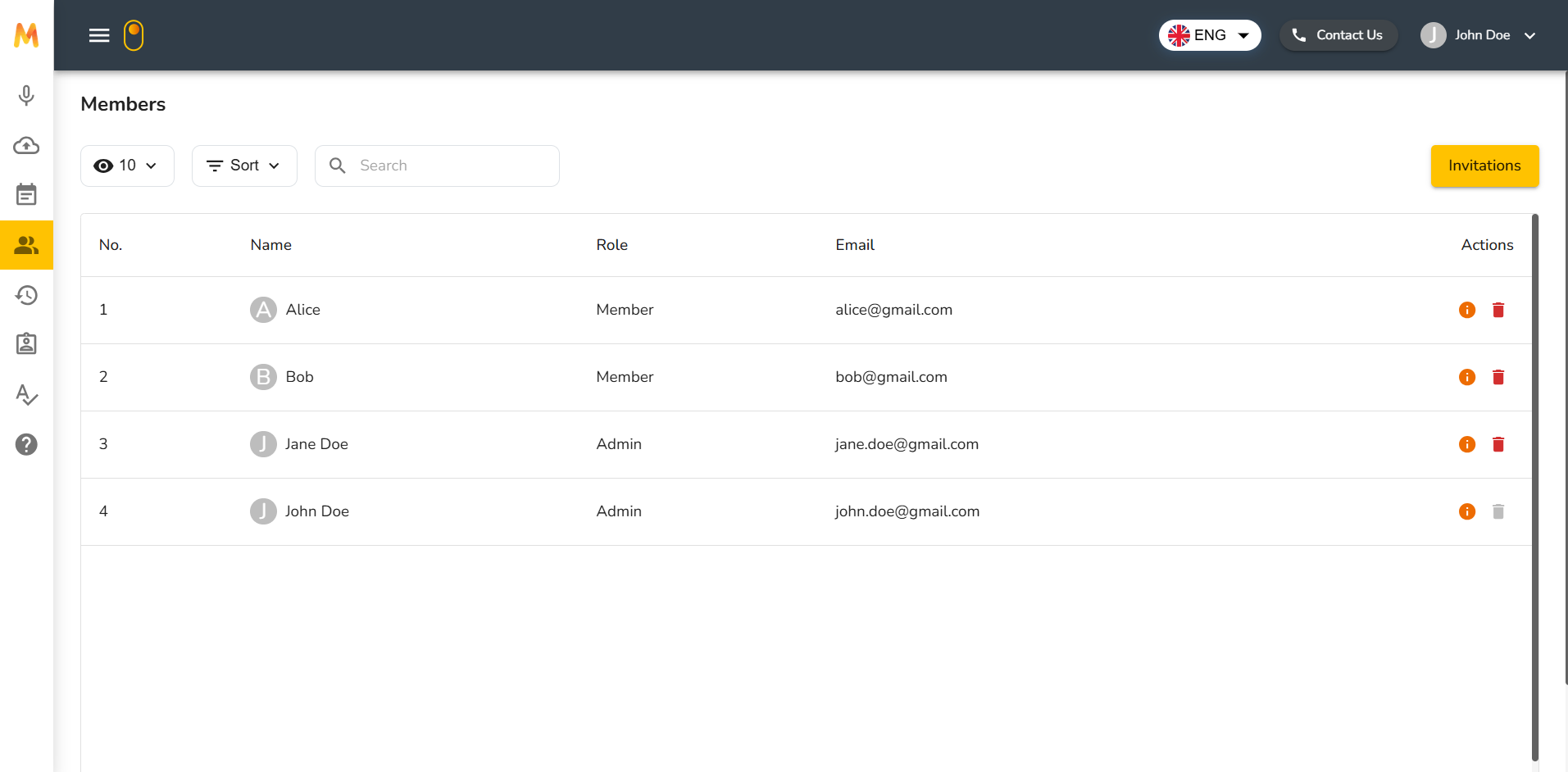 The **Members** page allows you to manage the members of your organization. This page is only available to those with the **Admin** role. As an admin, you can view all members in your organization, see their details, and invite new members.